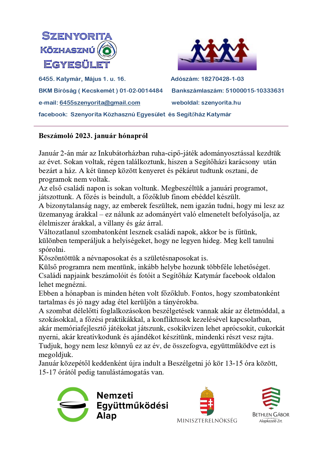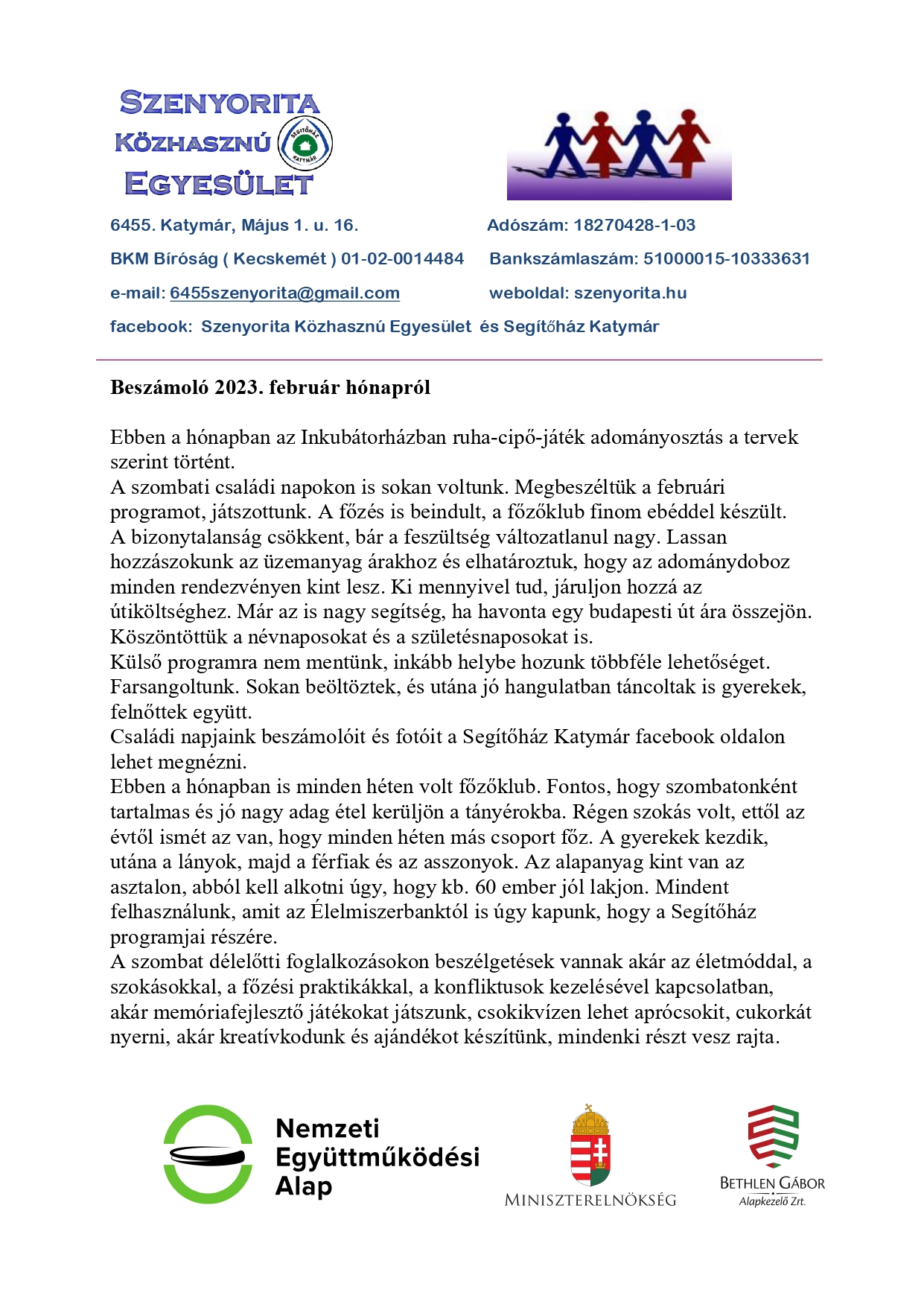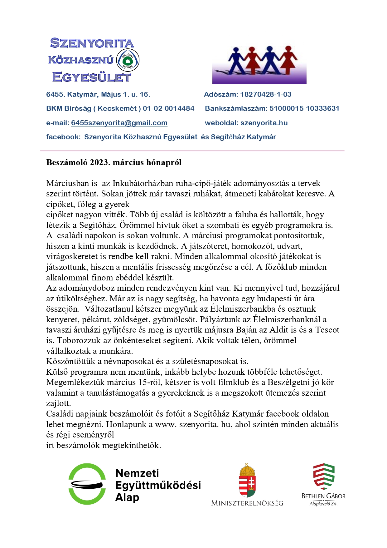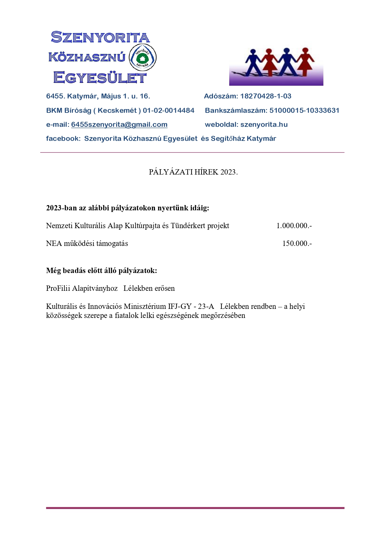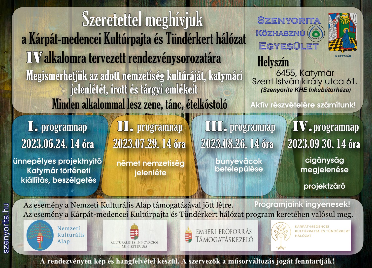 A Nemzeti Kulturális Alap és a Magyar Kultúráért Alapítvány által létrehozott Kárpát-medencei Kultúrpajta és Tündérkert hálózat támogatásával a Szenyorita Közhasznú Egyesület