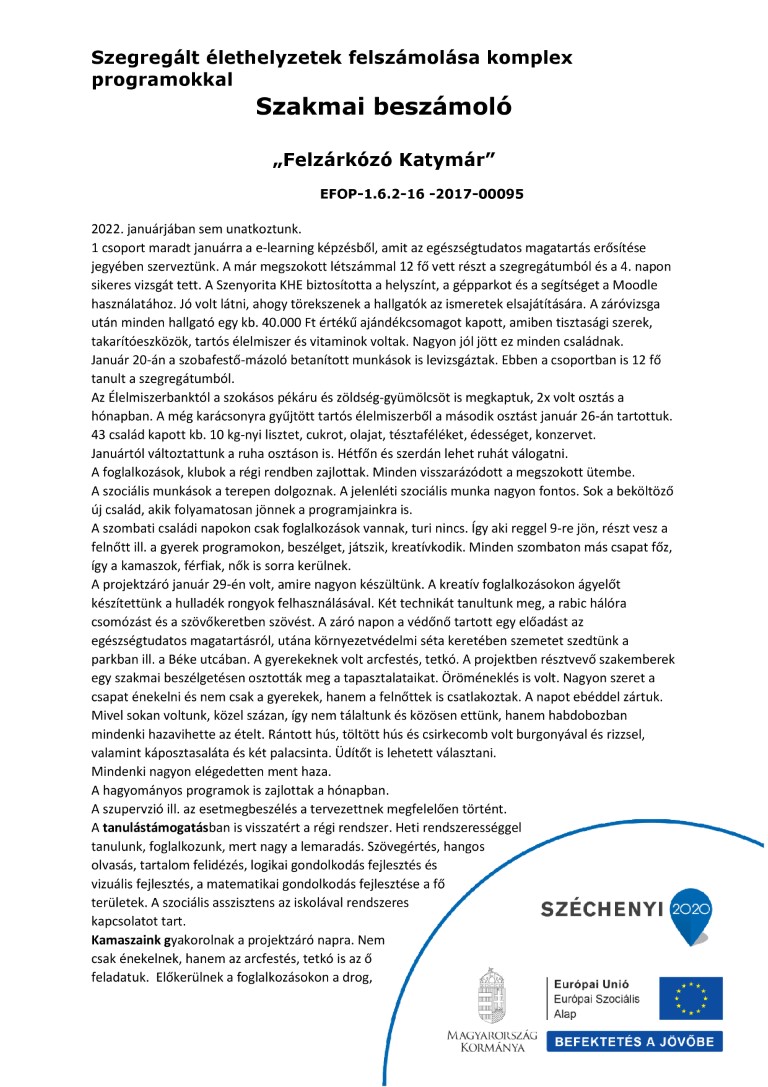 3 csoportban szerveztünk e-learning képzést az egészségtudatos magatartás erősítése jegyében. Ebből két turnus dec. 13-ával ill. 27-ével elindult. Mindkét csoportban 12-12 fő vett részt a szegregátumból és a 4. napon sikeres vizsgát tett. A Szenyorita KHE biztosította a helyszínt, a gépparkot és a segítséget a Moodly használatához. Jó volt látni, ahogy törekszenek a hallgatók az ismeretek elsajátítására.