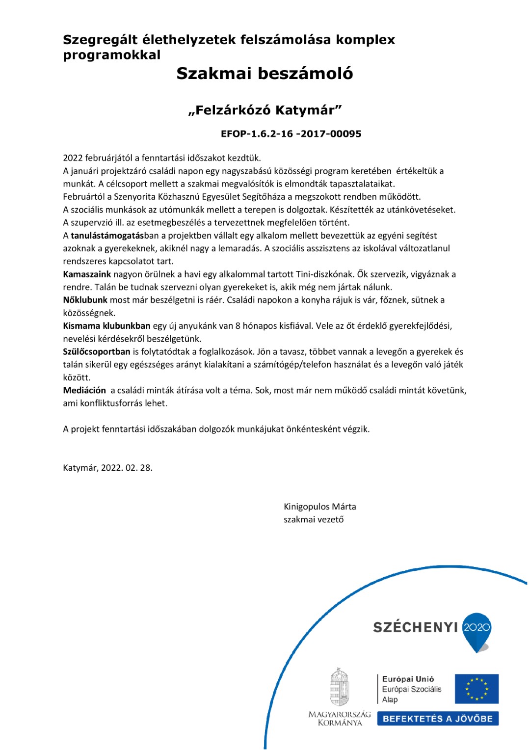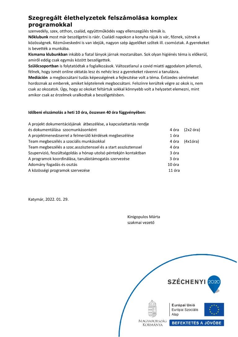 A szociális munkások a terepen dolgoznak. A jelenléti szociális munka nagyon fontos. Sok a beköltöző új család, akik folyamatosan jönnek a programjainkra is. Sajnos az új családok közül sok a deviáns, több lett a faluban a betörés, rongálás.