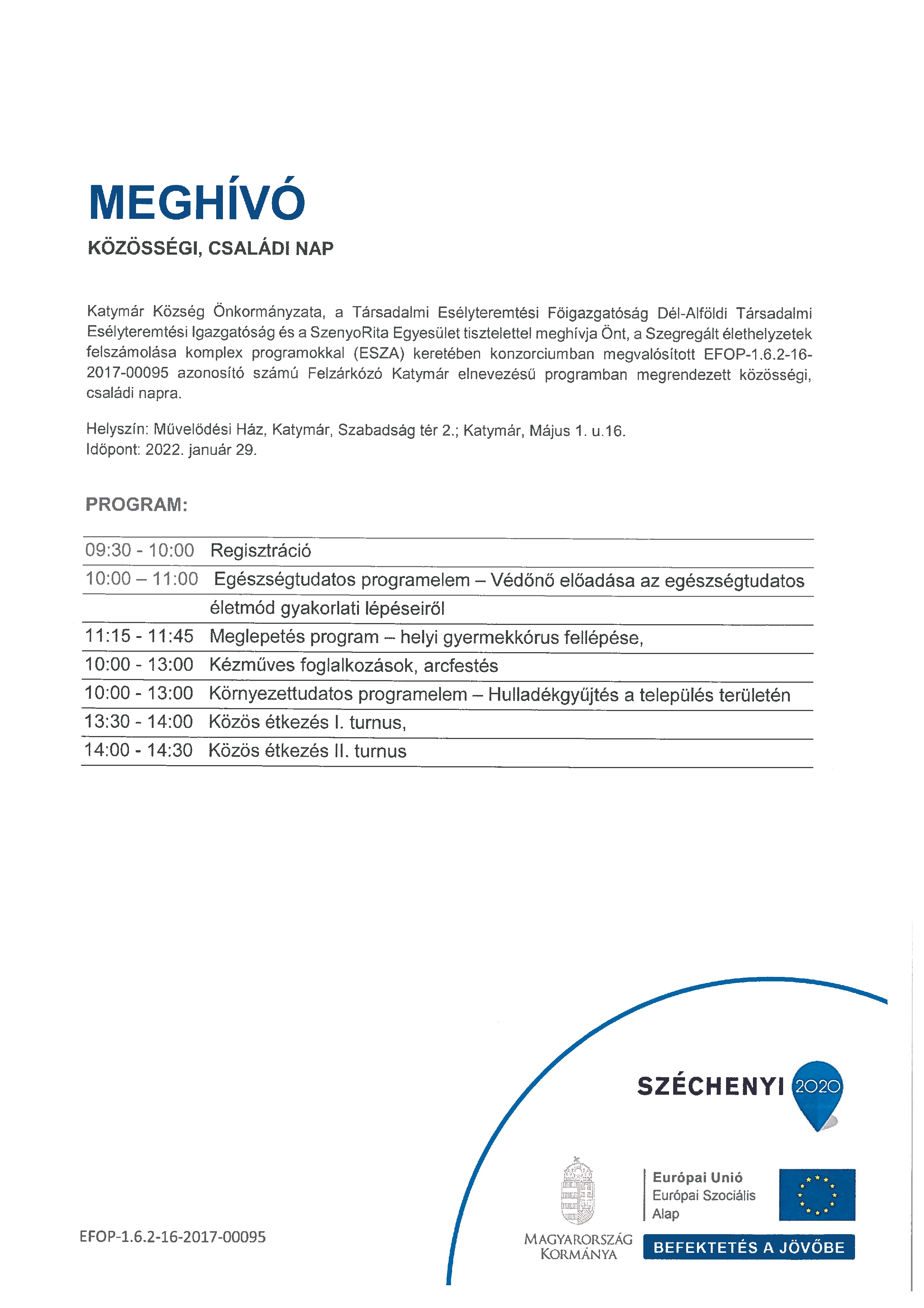 Másnap a Mindenki Karácsonya volt az Önkormányzat előtti téren. Igazi összefogással vendégeltük meg a falu apraja-nagyját. Volt zsíroskenyér, forralt bor, tea, sütemény, a Nyugdíjas Klub egy karácsonyi asztalnál látta vendégül az érdeklődőket, a Segítőház cipősdobozt és az Édes száj édességcsomagját osztotta. Lehetett játékok közül is válogatni. Nagyon kedves műsort adtak az ovisok, az iskola, a Nyugdíjas Klub és a Segítőház kórusa.